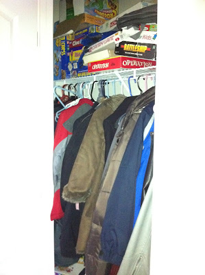 Pin It This horrible mess was known as my coat closet and a place for the kids to throw their board games.  When I say throw, I mean literally - THROW!  It is kind of embarrassing to show it in this condition, but it makes the after so much better.
